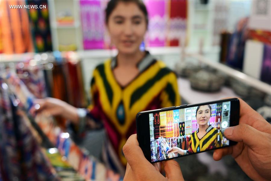A worker presents Etles silk product in a silk mill in Jiya Town of Hotan City, northwest China's Xinjiang Uygur Autonomous Region, Aug. 8, 2017. Etles silk, with a history of more than a thousand years in Hotan City, is regarded as the witness of the cultural mixture between China and the neighboring countries as it illustrates a perfect combination of Chinese silk production technique and surrounding central Asian countries' patterning. The production of the Eltes silk is now regaining its momentum as the local government invests more resources into the sector to revive the once vanishing craft. About 6,000 families in the Jiya Town are capable of producing the silk which brings 1,200 yuan (about 180 US dollars) extra income per capita for the local residents. [Photo/Xinhua] |