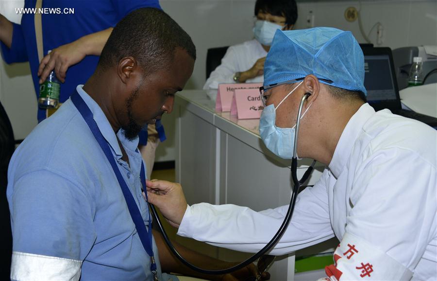 A doctor checks a man's heart in the Chinese hospital ship Peace Ark in Djibouti, on Aug. 24, 2017. The Peace Ark arrived in Djibouti on Wednesday and was expected to carry out a nine-day medical service in Djibouti. It will then travel to Sierra Leone, Gabon, Tanzania and other countries to provide free medical and humanitarian services. (Xinhua/Wang Shoubao) |