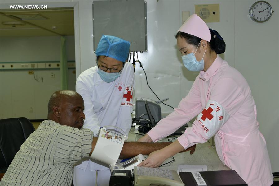 Medical workers check blood pressure for a man in the Chinese hospital ship Peace Ark in Djibouti, on Aug. 24, 2017. The Peace Ark arrived in Djibouti on Wednesday and was expected to carry out a nine-day medical service in Djibouti. It will then travel to Sierra Leone, Gabon, Tanzania and other countries to provide free medical and humanitarian services. (Xinhua/Wang Shoubao) |