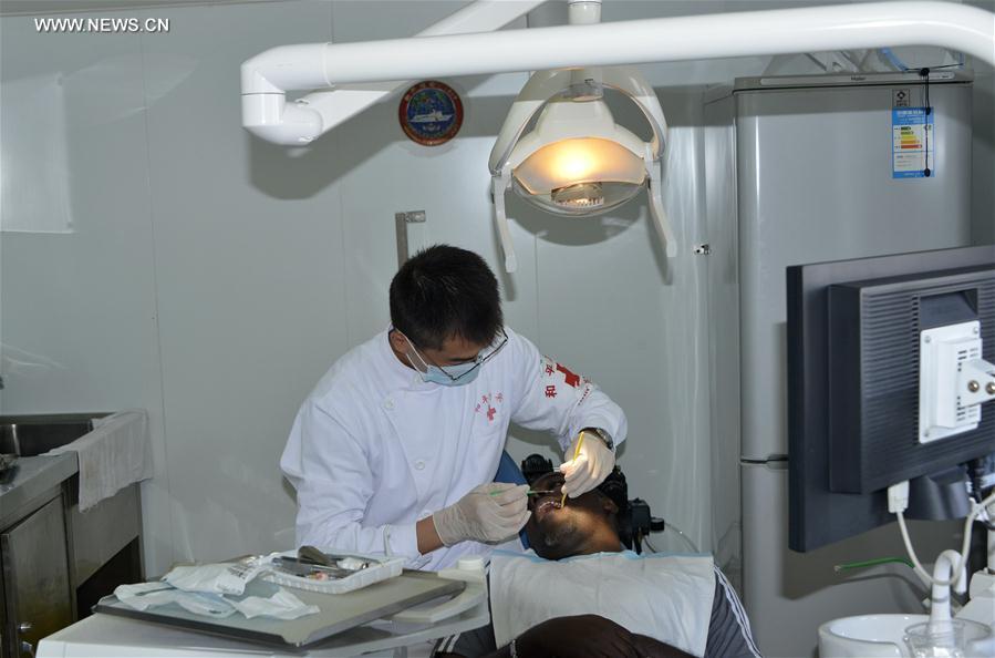 A doctor extracts a tooth for a man in the Chinese hospital ship Peace Ark in Djibouti, on Aug. 24, 2017. The Peace Ark arrived in Djibouti on Wednesday and was expected to carry out a nine-day medical service in Djibouti. It will then travel to Sierra Leone, Gabon, Tanzania and other countries to provide free medical and humanitarian services. (Xinhua/Wang Shoubao) |