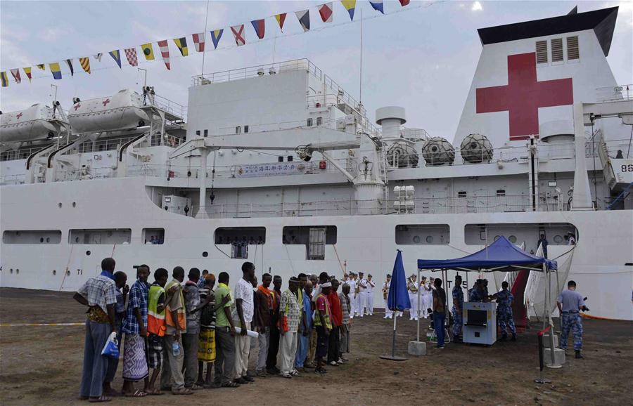 People wait in a queue to receive medical treatment in the Chinese hospital ship Peace Ark in Djibouti, on Aug. 26, 2017. The Peace Ark arrived in Djibouti on Wednesday and was expected to carry out a nine-day medical service in Djibouti. It will then travel to Sierra Leone, Gabon, Tanzania and other countries to provide free medical and humanitarian services. (Xinhua/Wang Shoubao) |