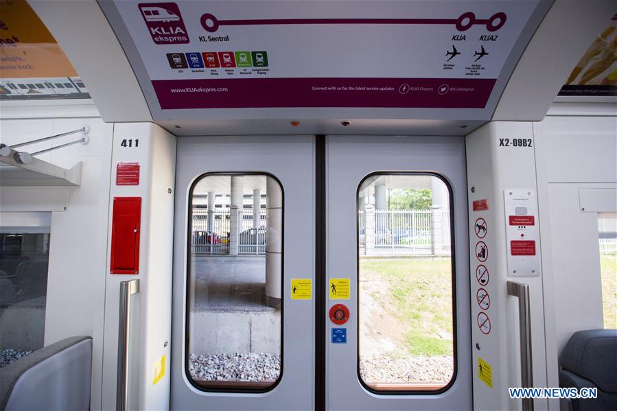 Photo taken on March 13, 2018 shows a view of the inside of the new KLIA Ekspres train at the Kuala Lumpur International Airport in Sepang, Malaysia. China's CRRC Changchun Railway Vehicles Co. Ltd (CRRC Changchun) and Malaysia's Express Rail Link (ERL) unveiled the new train that will be used for the Kuala Lumpur International Airport rail link service on Tuesday, concluding a deal signed in 2014 in which ERL agreed to buy six trains from CRRC Changchun. [Photo/Xinhua]