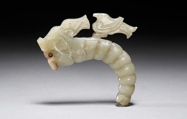 The worm is a mere 5.4 centimeters long. Its body is divided into nine segments, and it includes forelegs as well as middle and hind legs. Both its taut body and the slightly raised head are clear indications that the worm is in the process of spitting silk. It has been dated to the Han Dynasty.
