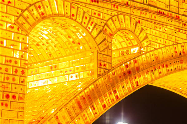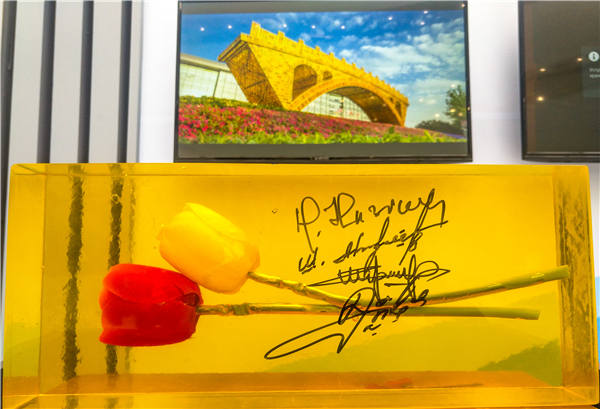 The bridge is constructed with approximately 20,000 artificial amber bricks, embedded within are the floral emblems from countries and regions involved in the initiative.