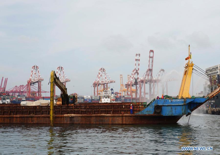 An engineering boat of the China Harbor Engineering Company (CHEC) excavates mud from sea water at the Port of Colombo, Colombo, Sri Lanka, Dec. 1, 2020. CHEC has begun construction for the expansion of the JCT in the Port of Colombo in Sri Lanka. Expansion of the fifth phase of the JCT was initiated on Tuesday. [Photo/Xinhua]