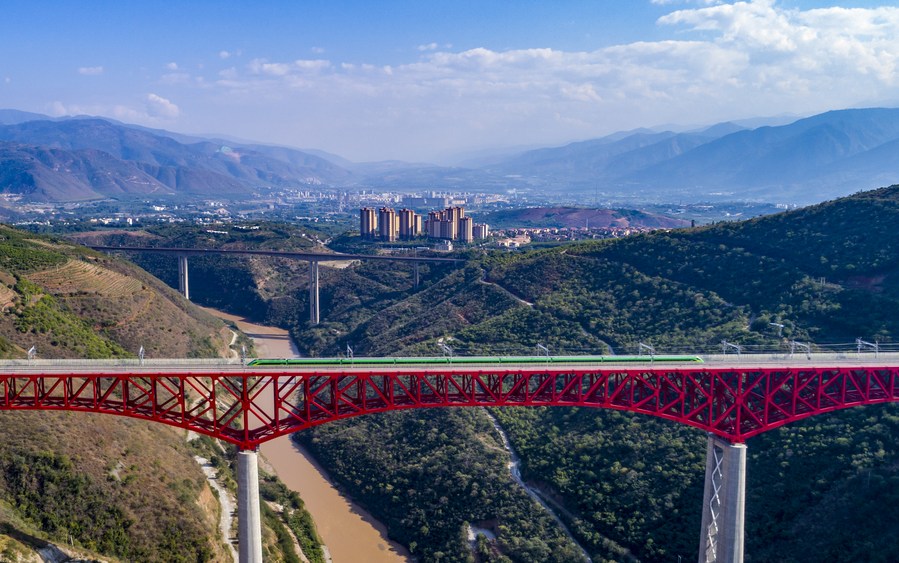 Aerial photo shows a train crossing the Yuanjiang major bridge over the Yuanjiang River in southwest China's Yunnan Province, Jan. 18, 2022. (Xinhua/Chen Xinbo)