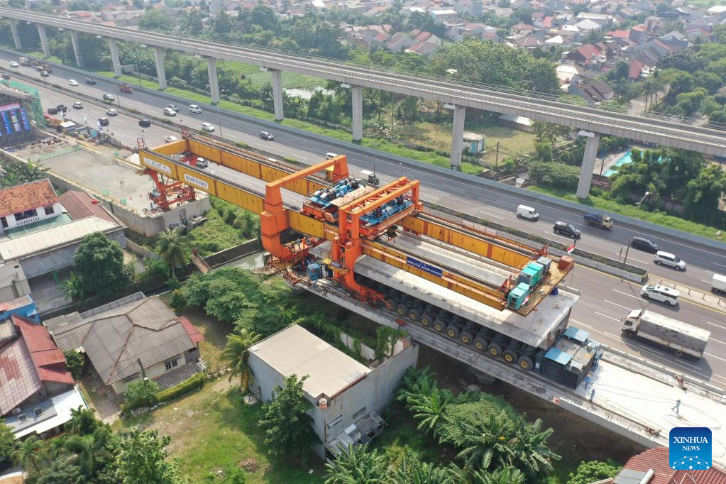 Aerial photo taken on June 24, 2022 shows a girder-erecting machine erecting the last box girder of the No.1 casting yard of the Jakarta-Bandung High-Speed Railway (HSR) in Bekasi, Indonesia. The No.1 casting yard of the Jakarta-Bandung High-Speed Railway (HSR) on Monday completed the erection of 1,018 box girders, laying a solid foundation for the completion of the railway project in June 2023. (Photo by Xiong Yunjie/Xinhua)