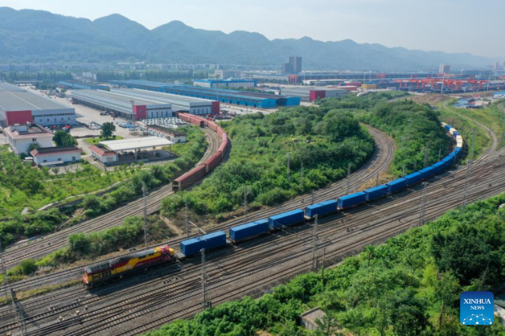 Aerial photo taken on June 30, 2022 shows a China-Europe freight train pulling out of the Tuanjiecun station in southwest China's Chongqing Municipality. As two freight trains left the Chengdu International Railway Port in Chengdu and the Tuanjiecun station in Chongqing for Lodz in Poland and Duisburg of Germany respectively, the total number of China-Europe freight train trips from southwest China's Chengdu and Chongqing has topped 20,000 on June 30. Major exports include commodities such as mechanical and electrical products, automobiles and components, food and beverage, clothing, etc. The China-Europe freight train service has played an important role in advancing high-quality Belt and Road cooperation. (Xinhua/Tang Yi)