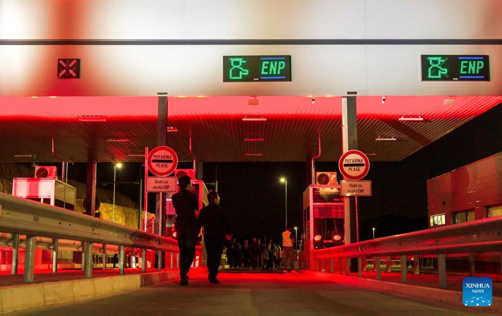 People walk through a toll booth of the Chinese-built highway section in Podgorica, Montenegro on July 13, 2022. The 41-km priority Smokovac-Matesevo section of Montenegro's Bar-Boljare Highway built by a Chinese company was opened Wednesday. (Xinhua/Shi Zhongyu)