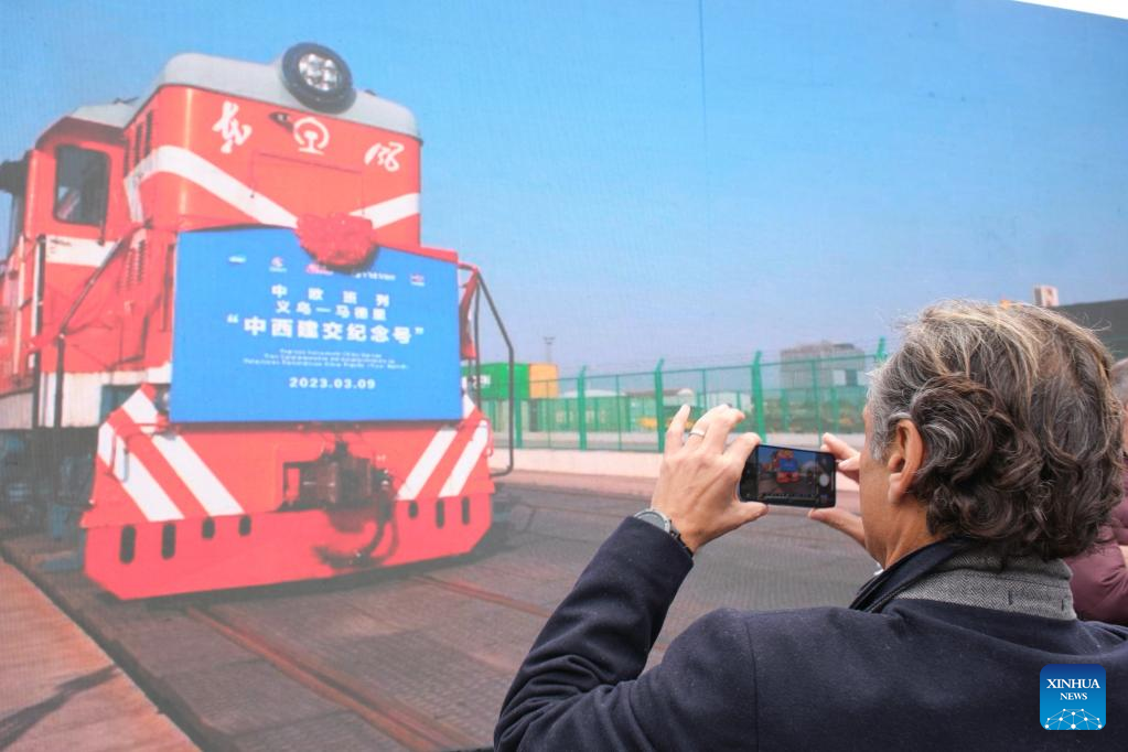A visitor takes photos of the live streaming screens showing a freight train departing from Yiwu West Railway Station of China in Madrid, Spain, March 9, 2023. A freight train loaded with 70 standard containers of Spanish goods, including red wine and olive oil, departed from Madrid and headed for Yiwu on Thursday. The commemoration trip came as Thursday marked the 50th anniversary of diplomatic relations between China and Spain. (Xinhua/Meng Dingbo)