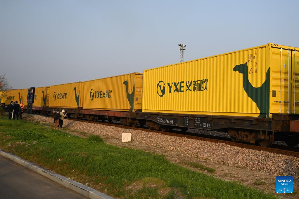 A freight train departs from Yiwu West Railway Station in Yiwu, east China's Zhejiang Province, March 9, 2023. A China-Europe train carrying 100 standard containers of China-made small commodities and ceramic products left Yiwu, a major hub of small commodities in east China's Zhejiang Province, for Madrid, Spain, Thursday. The commemoration trip came as Thursday marked the 50th anniversary of diplomatic relations between China and Spain. (Xinhua/Huang Zongzhi)