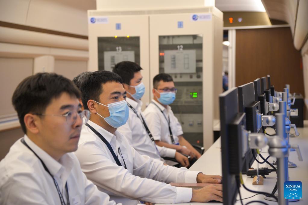 Engineers conduct catenary testing on the comprehensive inspection train during the joint commissioning and testing of the Jakarta-Bandung High-Speed Railway in Indonesia, May 22, 2023. The joint commissioning and testing of the Jakarta-Bandung High-Speed Railway (HSR) started on Monday, marking a milestone in the construction of the railway project. (Xinhua/Xu Qin)