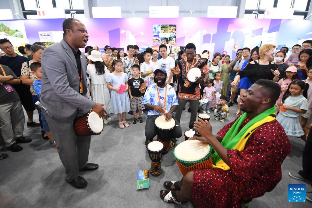 Staff members perform at an exhibition booth of the Ghanaian embassy in China at the 8th Colourful World -- Cultural Exhibition of Countries along the Belt and Road during the 2023 China International Fair for Trade in Services (CIFTIS) in Beijing, capital of China, Sept. 2, 2023. (Xinhua/Ju Huanzong)