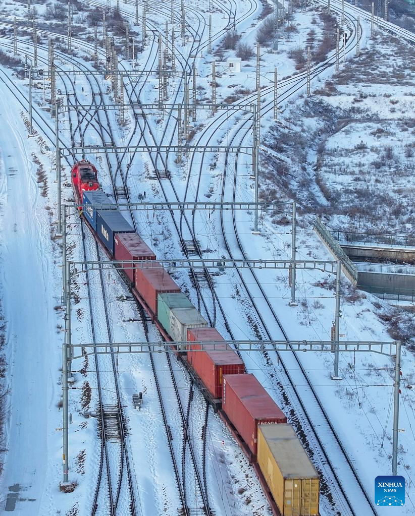 An aerial drone photo taken on Dec. 25, 2024 shows a China-Europe freight train bound for Kazakhstan passing through Horgos railway port in Horgos, northwest China's Xinjiang Uygur Autonomous Region.