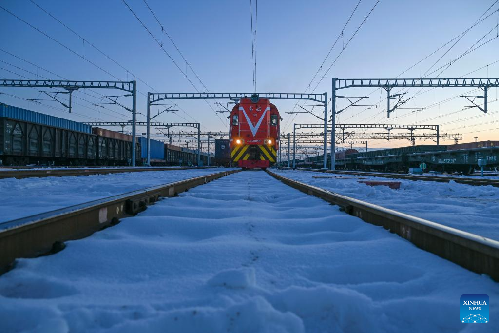 A China-Europe freight train bound for Kazakhstan waits for departure at the standard-gage yard of Horgos railway port in Horgos, northwest China's Xinjiang Uygur Autonomous Region, Dec. 25, 2024.