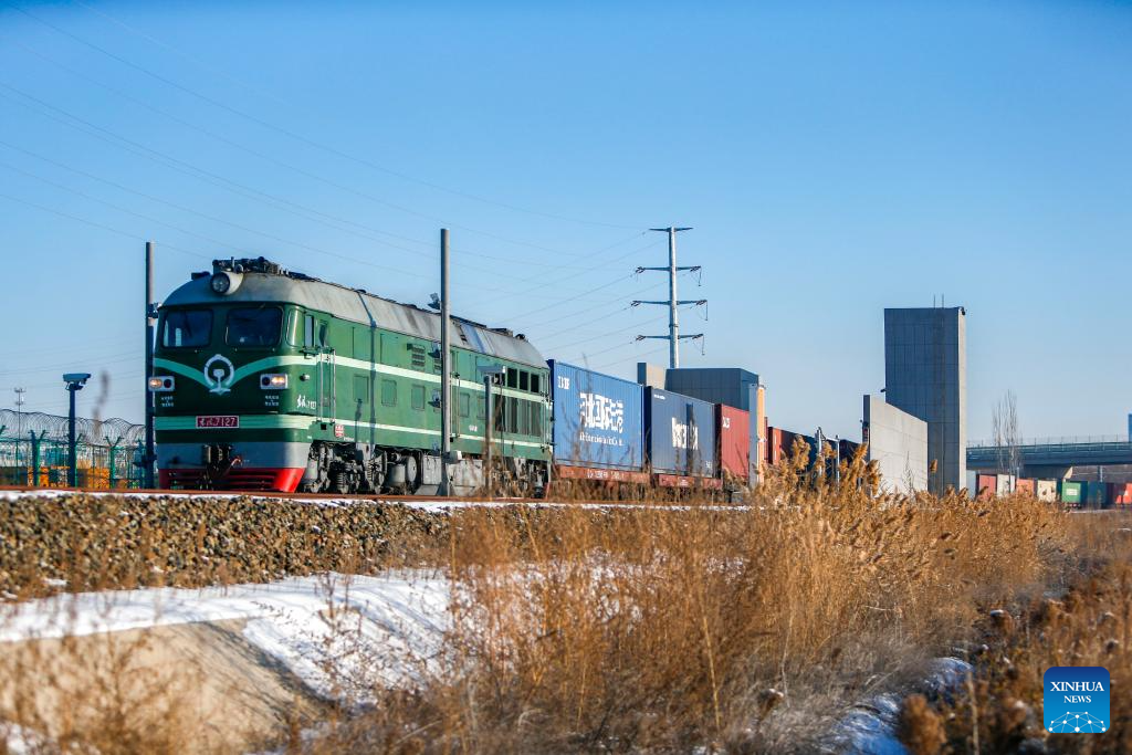A China-Europe freight train passes through an inspection system for large-size containers at Horgos railway port in Horgos, northwest China's Xinjiang Uygur Autonomous Region, Dec. 25, 2024.