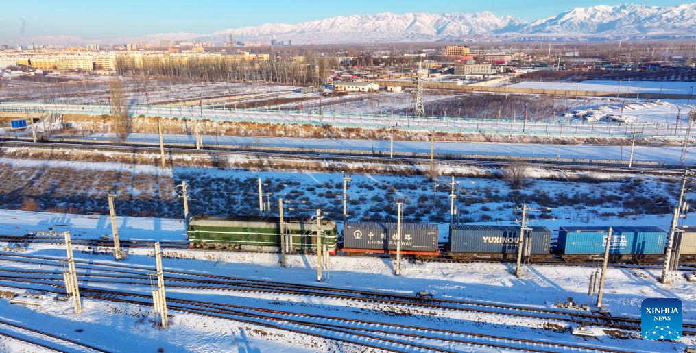 An aerial drone photo taken on Dec. 25, 2024 shows a China-Europe freight train bound for Kazakhstan passing through Horgos Port in Horgos, northwest China's Xinjiang Uygur Autonomous Region.