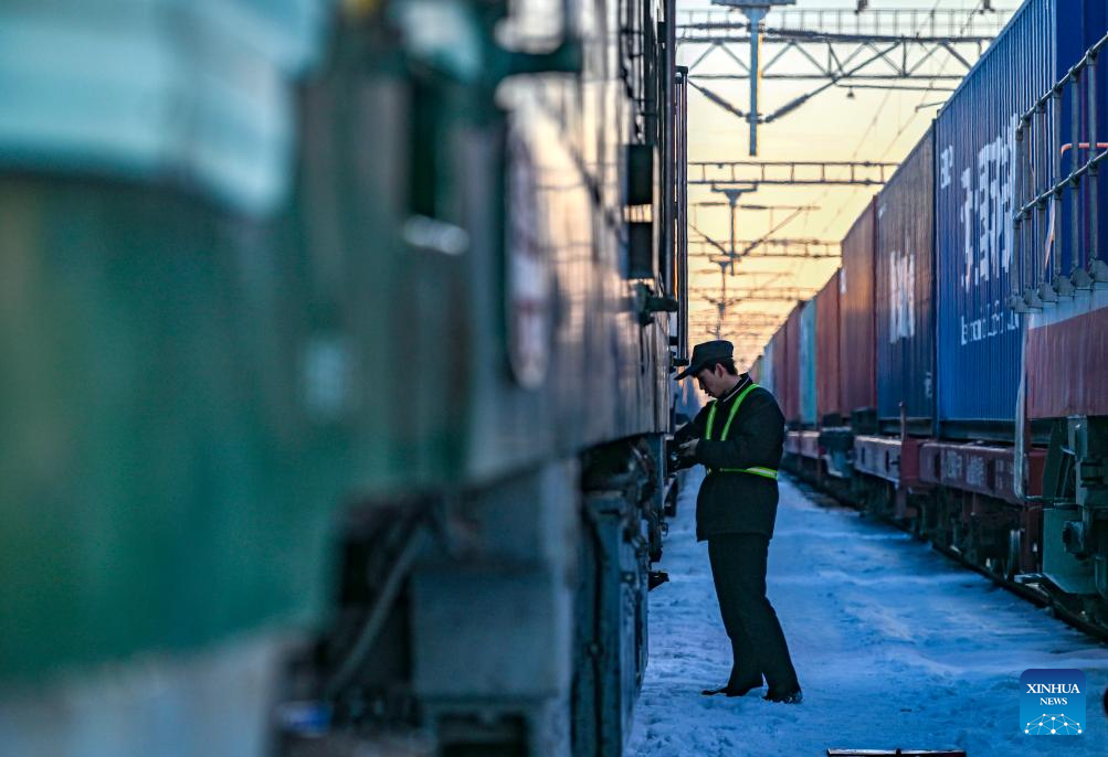 A driver of a China-Europe freight train checks hardware of the train before departure in Horgos, northwest China's Xinjiang Uygur Autonomous Region, Dec. 25, 2024.