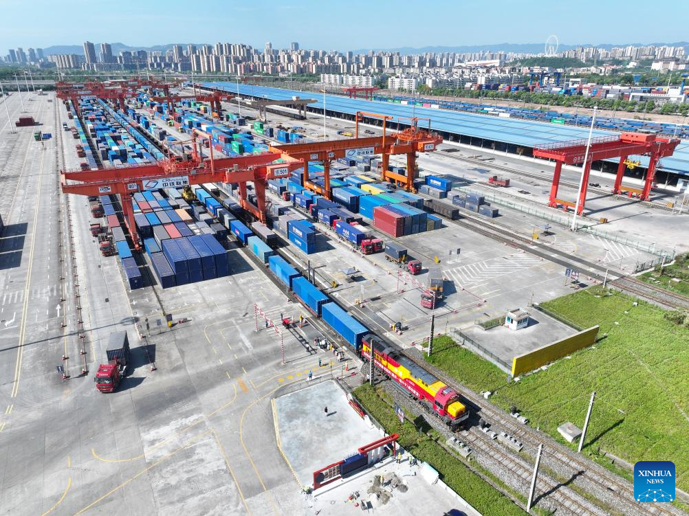 An aerial drone photo taken on April 20, 2025 shows a China-Central Asia freight train departing from the Tuanjiecun Station in southwest China's Chongqing. (Xinhua/Tang Yi)