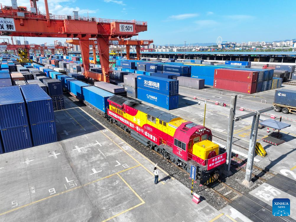 An aerial drone photo taken on April 20, 2025 shows a China-Central Asia freight train waiting for departure at the Tuanjiecun Station in southwest China's Chongqing. (Xinhua/Tang Yi)