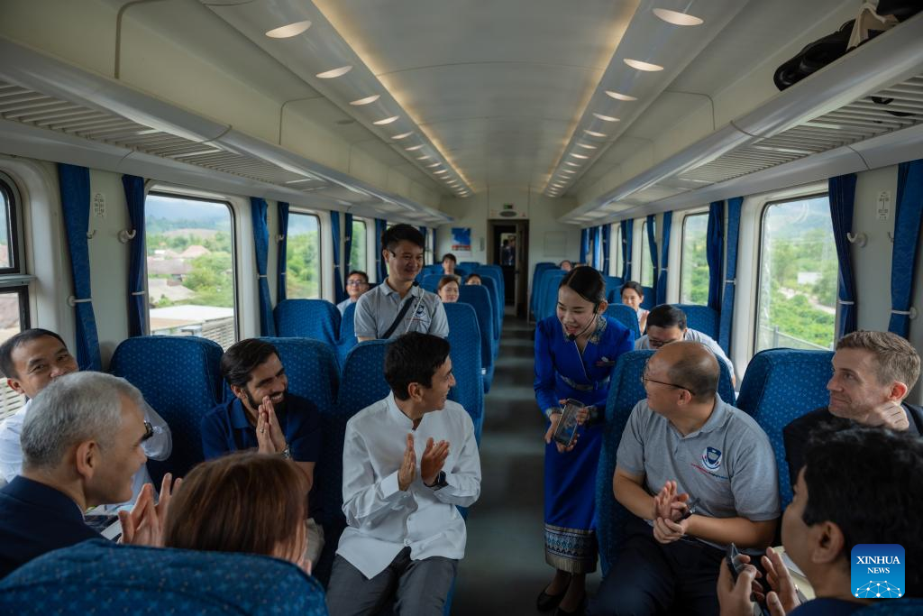 Representatives from UN agencies in Laos communicate with crew members on train K12 of China-Laos Railway in Laos, May 30, 2025. Representatives from UN agencies in Laos visited the China-Laos Railway to learn about the project's achievements in promoting regional connectivity, enhancing livelihoods, and advancing sustainable development, as well as to explore opportunities for future cooperation. (Photo by Kaikeo Saiyasane/Xinhua)