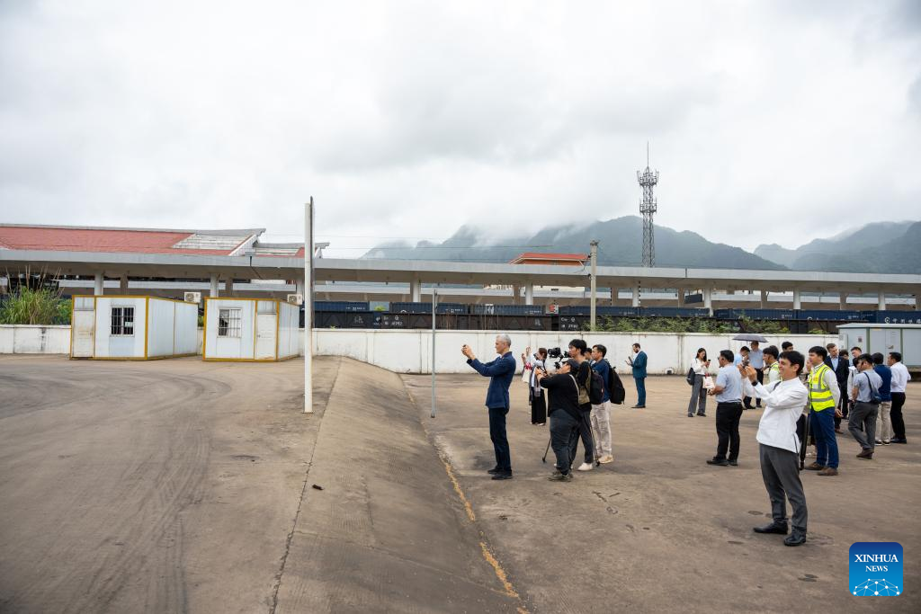 Representatives from UN agencies in Laos visit the Vang Vieng freight business yard in Laos, May 30, 2025. Representatives from UN agencies in Laos visited the China-Laos Railway to learn about the project's achievements in promoting regional connectivity, enhancing livelihoods, and advancing sustainable development, as well as to explore opportunities for future cooperation. (Photo by Kaikeo Saiyasane/Xinhua)