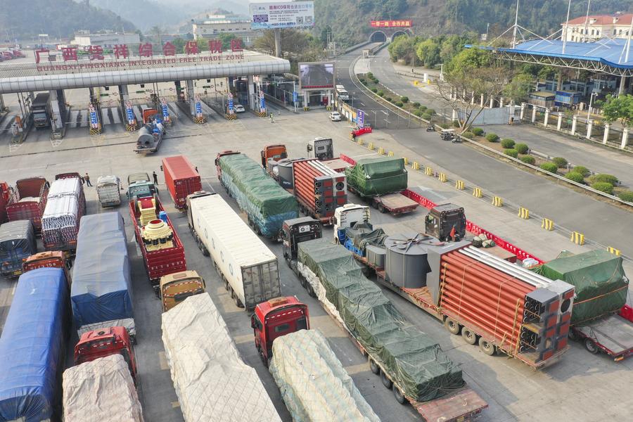 An aerial drone photo taken on March 21, 2025 shows trucks loaded with equipment for export to Vietnam in Guangxi Pingxiang Integrated Free Trade Zone in Pingxiang, south China's Guangxi Zhuang Autonomous Region. (Xinhua/Cao Yiming)