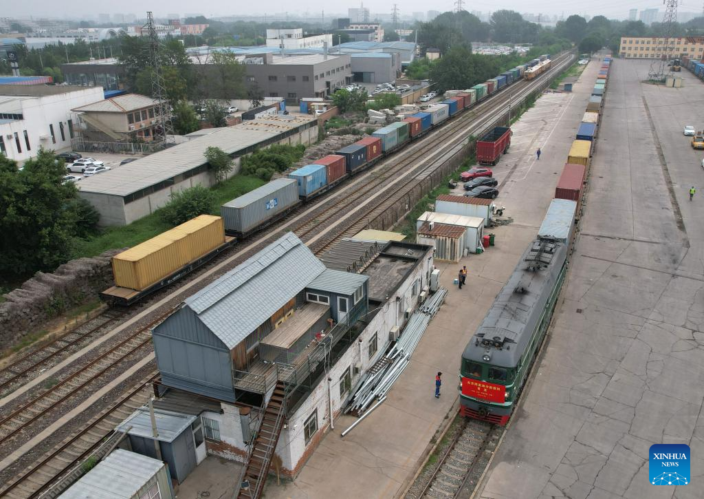 An aerial drone photo shows a China-Europe freight train waiting for departure at Beijing International Land Port in Fangshan District of Beijing, capital of China, June 30, 2025. A new China-Europe freight train route linking Beijing to Baku of Azerbaijan was launched Monday. Riding on the "rail-sea-rail" multimodal transport, the payload is scheduled to get across the Caspian Sea by ship, and arrive in Baku in 15 days. (Xinhua/Zhang Chenlin)