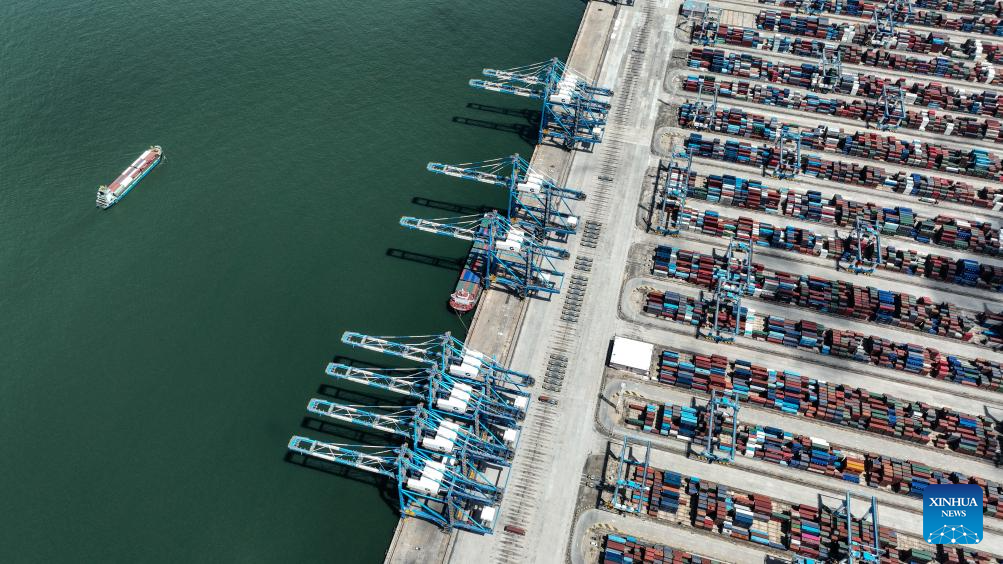 An aerial drone photo taken on July 3, 2025 shows an ocean vessel fully loaded with containers docking at an automated container terminal of Qinzhou Port, in Qinzhou City, south China's Guangxi Zhuang Autonomous Region. Cargo volume on the New International Land-Sea Trade Corridor surged 76.9 percent year on year to 746,000 twenty-foot equivalent units (TEUs) in the first six months of this year, according to the China Railway Nanning Group. (Xinhua/Zhang Ailin)