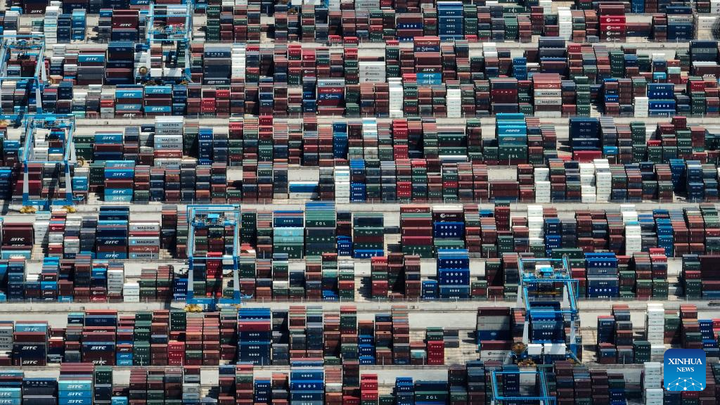 An aerial drone photo taken on July 3, 2025 shows a container yard of an automated container terminal of Qinzhou Port in Qinzhou City, south China's Guangxi Zhuang Autonomous Region. Cargo volume on the New International Land-Sea Trade Corridor surged 76.9 percent year on year to 746,000 twenty-foot equivalent units (TEUs) in the first six months of this year, according to the China Railway Nanning Group. (Xinhua/Zhang Ailin)
