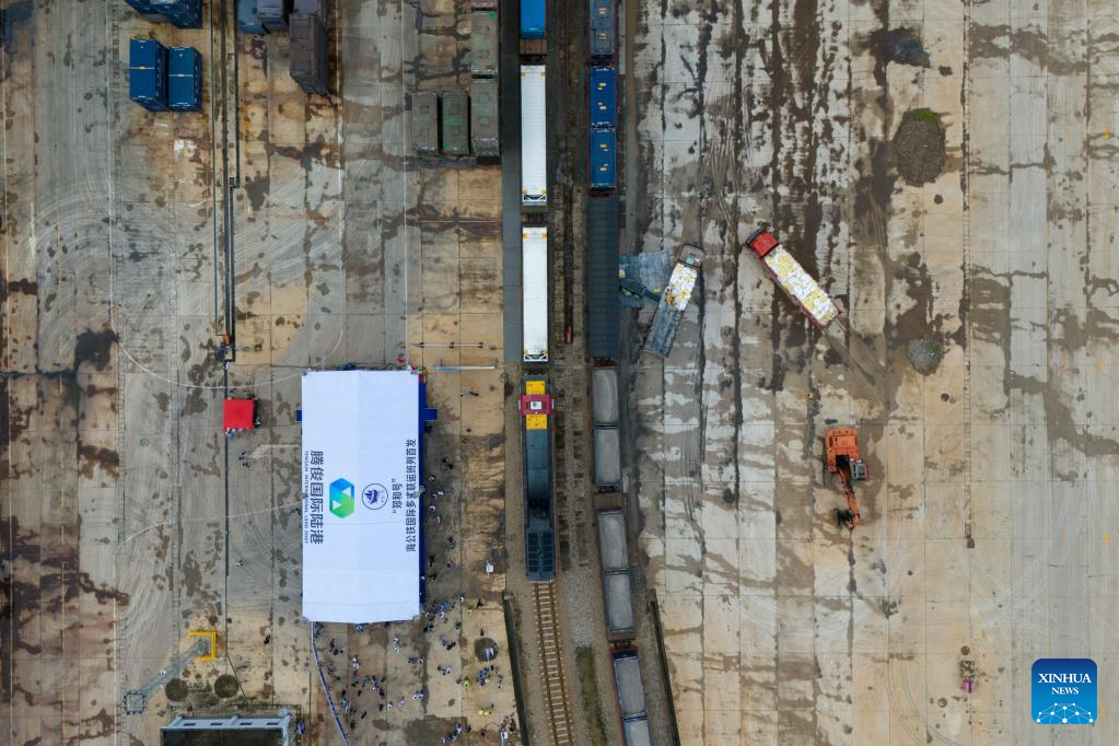 An aerial drone photo shows the first train of the "Zheng He" Sea-Road-Rail International Multimodal Transport Service waiting for departure at Tengjun International Land Port in Kunming, capital of southwest China's Yunnan Province, July 4, 2025. The train left Kunming on Friday. After arriving in Vientiane of Laos via the China-Laos Railway, the goods will be transported to Thailand, Singapore and Bangladesh through other three routes. (Xinhua/Peng Yikai)