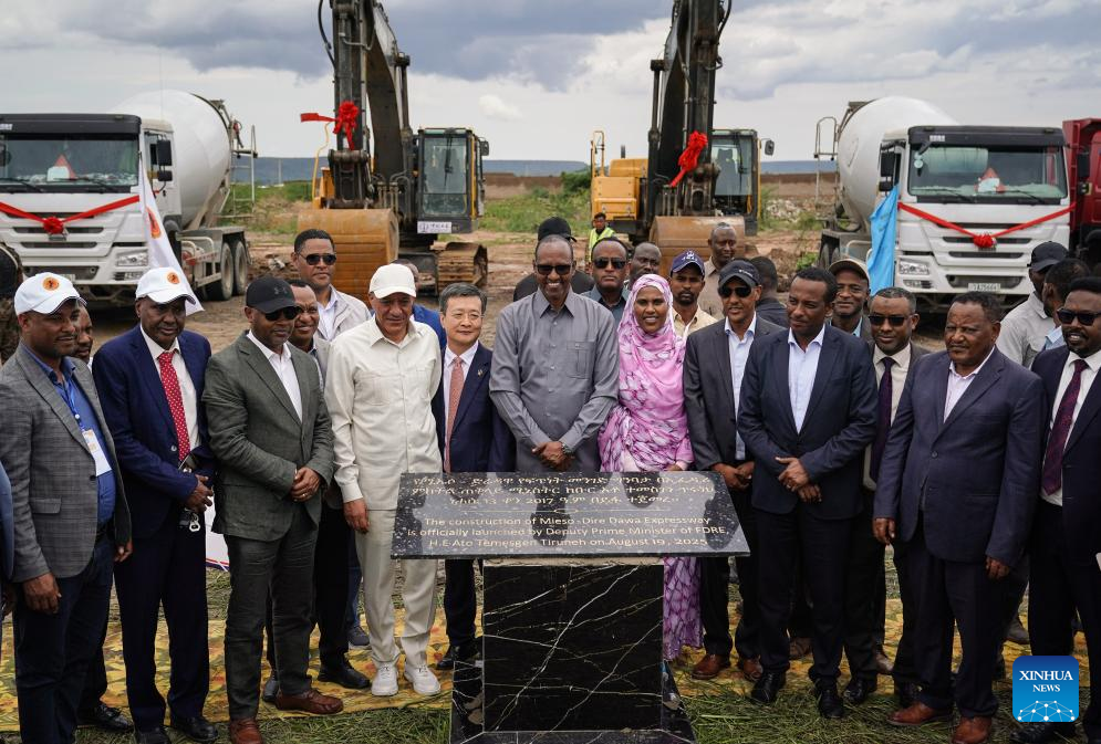 Guests attend the launching ceremony of the construction of the Mieso-Dire Dawa Expressway, in Dire Dawa, eastern Ethiopia, on Aug. 19, 2025. The construction of the Mieso-Dire Dawa Expressway, a major infrastructure project within the Ethio-Djibouti Transport Corridor, was launched on Tuesday. (Xinhua/Han Xu)