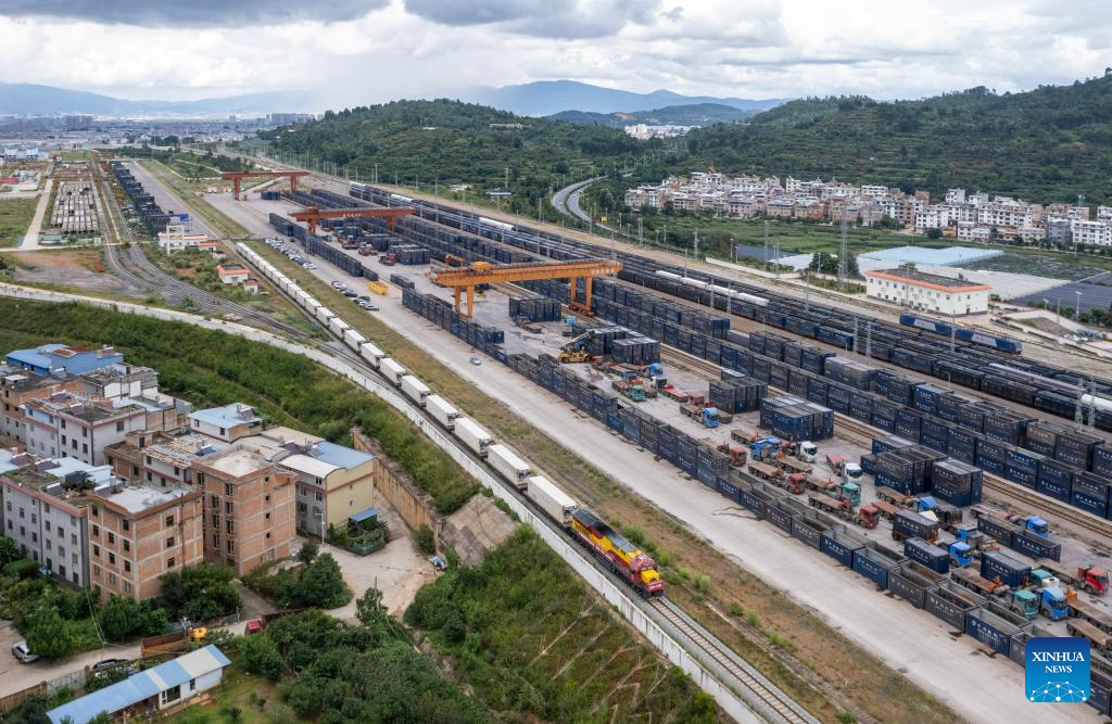 An aerial drone photo taken on Aug. 23, 2025 shows an international freight train bound for Lao capital Vientiane departing from Yanhe Station of China-Laos Railway in Yuxi City, southwest China's Yunnan Province. The China-Laos Railway launched two-way operations of the international freight train service between Yuxi and Vientiane on Saturday. Since its inauguration in December 2021, the China-Laos Railway has transported over 64.5 million tonnes of goods by the end of July this year, including more than 14.9 million tonnes of cross-border cargo. (Xinhua/Chen Xinbo)