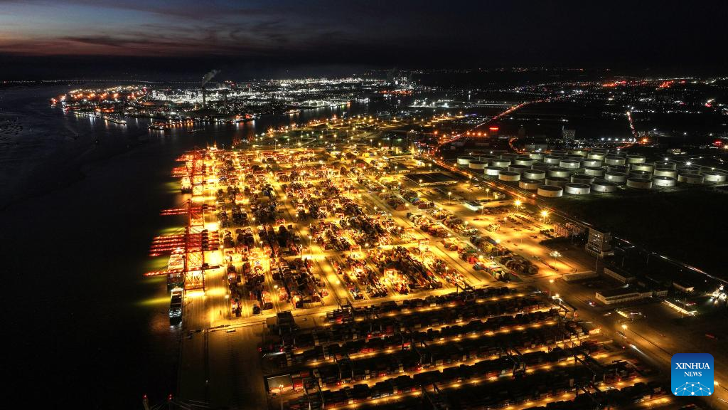 An aerial drone photo taken on Sept. 4, 2025 shows the Qinzhou Port in Qinzhou City, south China's Guangxi Zhuang Autonomous Region. The New International Land-Sea Trade Corridor saw over 1 million twenty-foot equivalent units (TEUs), an increase of 72.5 percent year-on-year, being transported by the rail-sea intermodal freight trains as of Sept. 4 this year. (Xinhua/Zhang Ailin)
