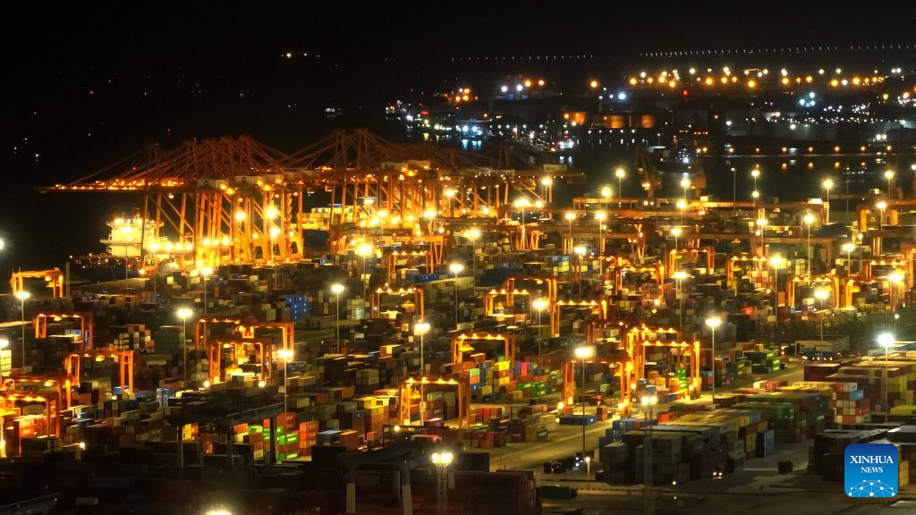 An aerial drone photo taken on Sept. 4, 2025 shows the Qinzhou Port in Qinzhou City, south China's Guangxi Zhuang Autonomous Region. The New International Land-Sea Trade Corridor saw over 1 million twenty-foot equivalent units (TEUs), an increase of 72.5 percent year-on-year, being transported by the rail-sea intermodal freight trains as of Sept. 4 this year. (Xinhua/Zhang Ailin)