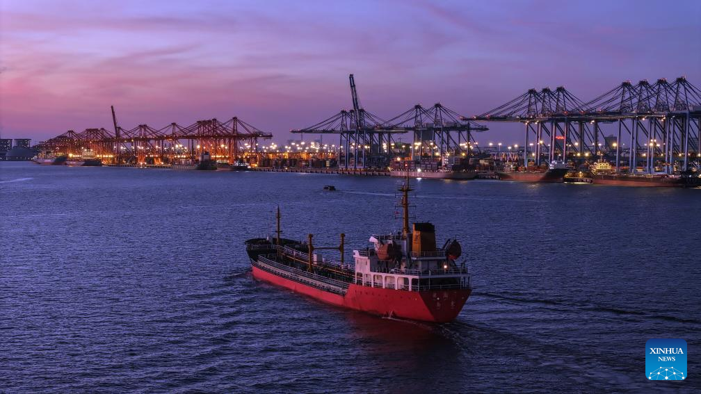 An aerial drone photo taken on Sept. 4, 2025 shows a cargo ship pulling into the Qinzhou Port in Qinzhou City, south China's Guangxi Zhuang Autonomous Region. The New International Land-Sea Trade Corridor saw over 1 million twenty-foot equivalent units (TEUs), an increase of 72.5 percent year-on-year, being transported by the rail-sea intermodal freight trains as of Sept. 4 this year. (Xinhua/Zhang Ailin)