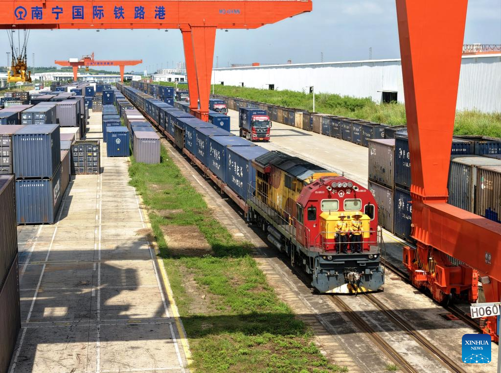 An aerial drone photo taken on Sept. 23, 2025 shows a China-Vietnam freight train pulling out of the Nanning International Railway Port in Nanning, south China's Guangxi Zhuang Autonomous Region. As of Sept. 22, freight trains departing from Guangxi heading to Vietnam have transported a total of 26,000 TEUs (twenty-foot equivalent units) of export goods, marking a year-on-year surge of 173 percent, according to the China Railway Nanning Group Co., Ltd. (Xinhua/Xing Guangli)