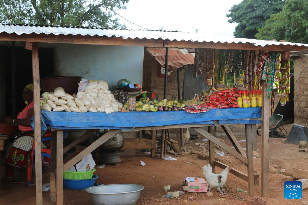 This photo taken on Sept. 1, 2025 shows a grocery store along the road from Odienne to Mali and Guinea in Kabadougou region, Denguele district of Cote d'Ivoire. In northern Cote d'Ivoire, a new two-lane highway hums with trucks while women balance baskets of mangoes and bananas, calling out to passing drivers along the roadside.