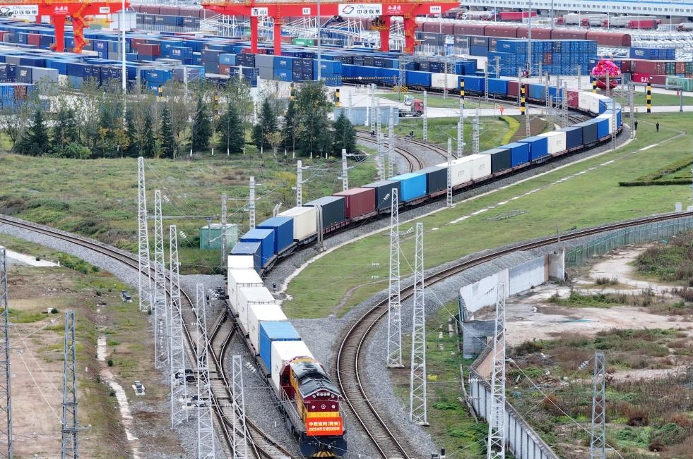 An aerial drone photo taken on Nov. 17, 2025 shows a China-Europe freight train departing from the Xi'an International Port Station in Xi'an, northwest China's Shaanxi Province. The Xi'an International Port Station handled a total of 5,063 China-Europe freight train trips in the first ten months of this year, up by 16.3 percent year on year, according to data from China State Railway Group Co., Ltd. (Xinhua/Shao Rui)