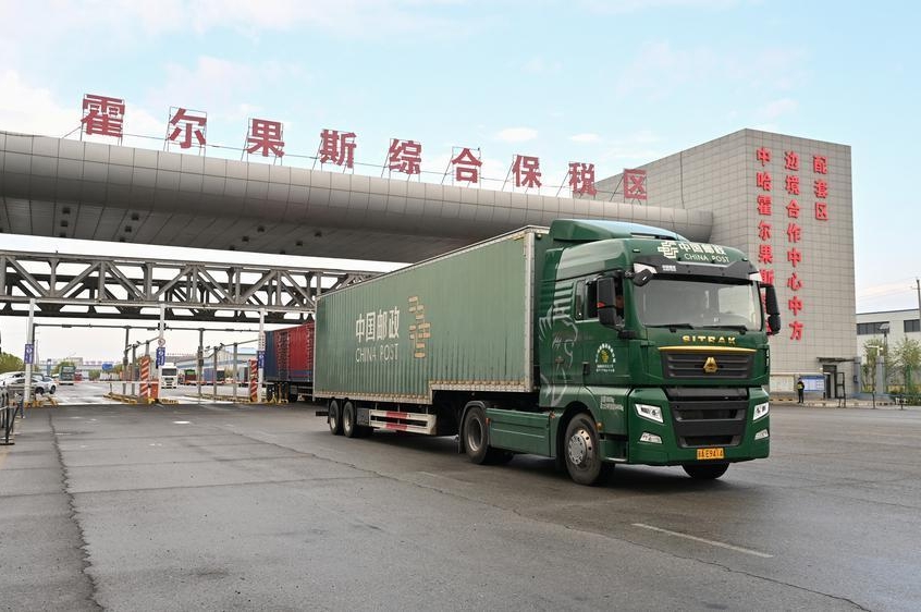 A postal truck leaves the comprehensive bonded zone of Horgos in Horgos, northwest China's Xinjiang Uygur Autonomous Region, Sept. 11, 2025. (Xinhua/Li He)