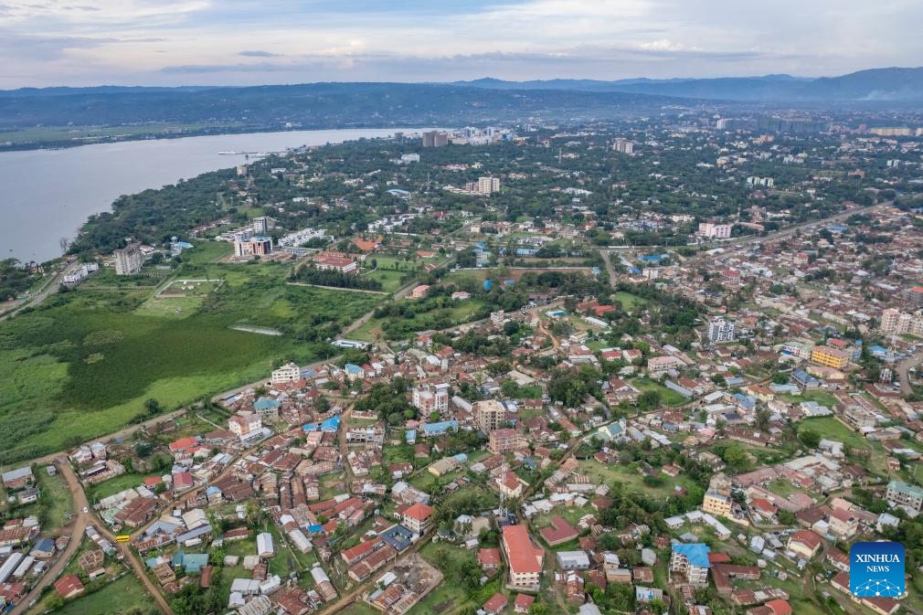 An aerial drone photo taken on Feb. 27, 2026 shows a view of Kisumu, a key economic and transport hub in western Kenya. Located in Kisumu County, a key economic and transport hub in western Kenya, the area is well known for sugarcane cultivation and sugar production. A road project undertaken by Power Construction Corporation of China (PowerChina) is now bringing visible change to the region. (Xinhua/Xie Jianfei)