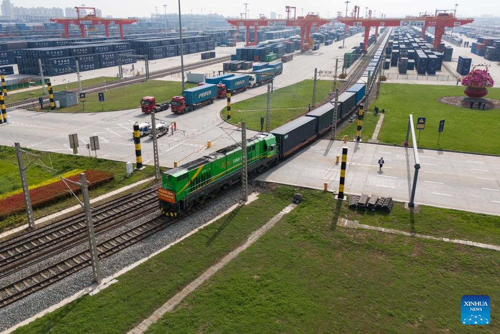 An aerial drone photo taken on April 24, 2026 shows a China-Europe freight train departing from the Xi'an International Port Station in Xi'an, northwest China's Shaanxi Province. The Xi'an International Port Station has handled over 2,000 China-Europe freight train trips this year. The total freight volume transported has exceeded 2.1 million tonnes in this period. (Xinhua/Zou Jingyi)