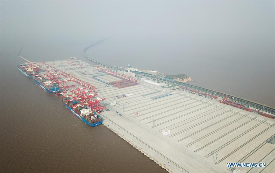 Photo taken on Dec. 10, 2017 shows the Phase IV of Shanghai Yangshan Deep Water Port in Shanghai, east China. Located at the south of Donghai Bridge, phase IV of the Yangshan Port, the world's biggest automated container terminal, started trial operations on Sunday. It covers 2.23 million square meters and has a 2,350-meter shoreline. Once it enters full operation, the fourth phase of the Yangshan Port will initially be able to handle 4 million TEUs (twenty-foot equivalent units). The number will expand to 6.3 million TEUs at a later stage. [Photo/Xinhua]