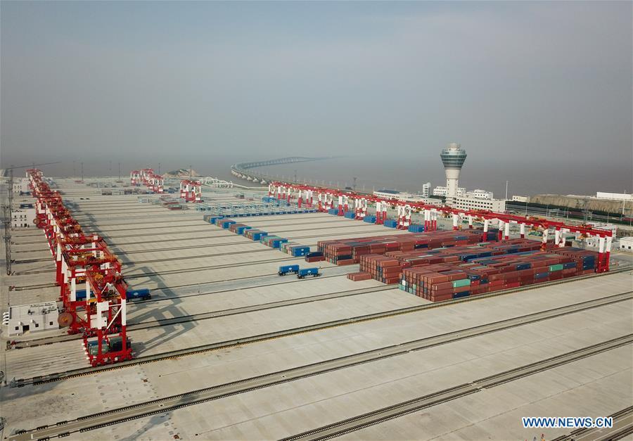 Photo taken on Dec. 10, 2017 shows the Phase IV of Shanghai Yangshan Deep Water Port in Shanghai, east China. Located at the south of Donghai Bridge, phase IV of the Yangshan Port, the world's biggest automated container terminal, started trial operations on Sunday. It covers 2.23 million square meters and has a 2,350-meter shoreline. Once it enters full operation, the fourth phase of the Yangshan Port will initially be able to handle 4 million TEUs (twenty-foot equivalent units). The number will expand to 6.3 million TEUs at a later stage. [Photo/Xinhua]