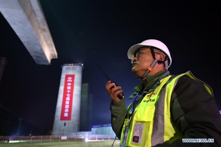 A worker observes the swiveling of a section of a bridge of Shangqiu-Hefei-Hangzhou high-speed railway in central China's Henan Province, Dec. 19, 2017. The 794.55-kilometer railway will link Shangqiu in central China's Henan Province, Hefei, capital of east China's Anhui Province, and Hangzhou, capital of Zhejiang. [Photo/Xinhua]