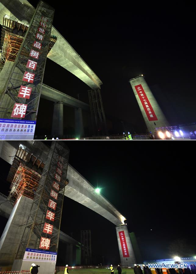 Combo photo taken on Dec. 18, 2017 (up) and Dec. 19, 2017 (down) shows the workers swiveling a part of a bridge into place at the construcion site of the bridge of Shangqiu-Hefei-Hangzhou high-speed railway in central China's Henan Province. The 794.55-kilometer railway will link Shangqiu in central China's Henan Province, Hefei, capital of east China's Anhui Province, and Hangzhou, capital of Zhejiang. [Photo/Xinhua]
