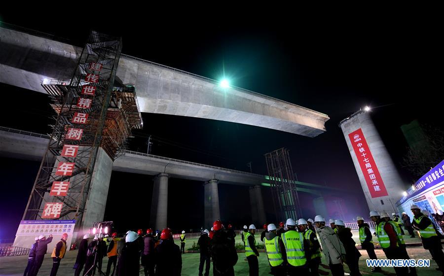 Engineers work at the construction site of a bridge of Shangqiu-Hefei-Hangzhou high-speed railway in central China's Henan Province, Dec. 19, 2017. The 794.55-kilometer railway will link Shangqiu in central China's Henan Province, Hefei, capital of east China's Anhui Province, and Hangzhou, capital of Zhejiang. [Photo/Xinhua]