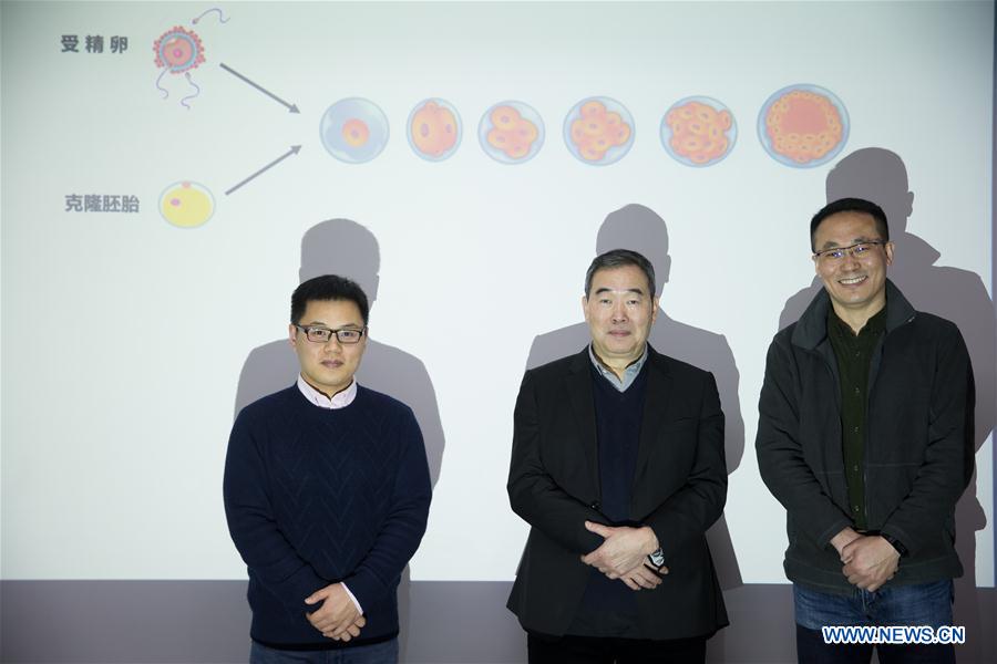 Liu Zhen (L), a postdoctoral fellow and the first author of the research paper published on Cell, Muming Poo (C), a co-author on the study who directs the Institute of Neuroscience of the Chinese Academy of Sciences (CAS) Center for Excellence in Brain Science and Intelligence Technology, and Sun Qiang, director of the non-human-primate research facility under CAS, pose for photos on Jan. 21, 2018. China on Thursday announced it successfully cloned world's first macaques from somatic cells by the method that made Dolly. [Photo/Xinhua]