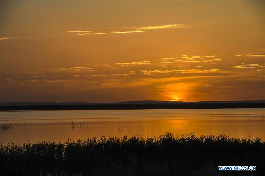 Aerial photo taken on July 6, 2018 shows the scenery of Taitema Lake, where the under-construction Yuli-Ruoqiang expressway runs through, in Qiemo County, northwest China's Xinjiang Uygur Autonomous Region. During the construction, many efforts have been devoted to protecting the ecological environment of Taitema Lake, which separates Taklimakan Desert and Kum Tag Desert. [Photo/Xinhua]