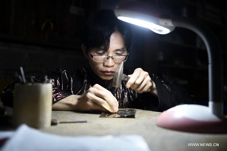 Ma Guibing works on his Miao ethnic silver ornament in Rongshui Miao Autonomous County, south China's Guangxi Zhuang Autonomous Region, June 14, 2017. (Xinhua/Lu Peng)